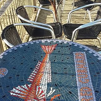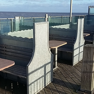 A walk along Southwold Pier takes you into a different world. Our first sight is of small, round, outdoor café tables that have been beautifully mosaicked with images of local fish. Next we encounter some sensible, salt-resistant seating, made of galvanized metal with solid stone tables. This makes good sense since it is in the more exposed part of the pier, where wind–protection is likely to be much appreciated.